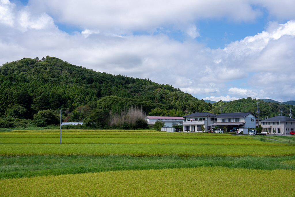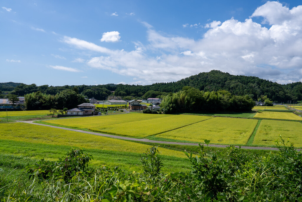 Tsukijigaoka Park provides an early highlight, including a monument connected to a well-known children’s song associated with the area. Beyond the park, vivid green rice paddies stretch across the landscape in growing season, backed by low hills.