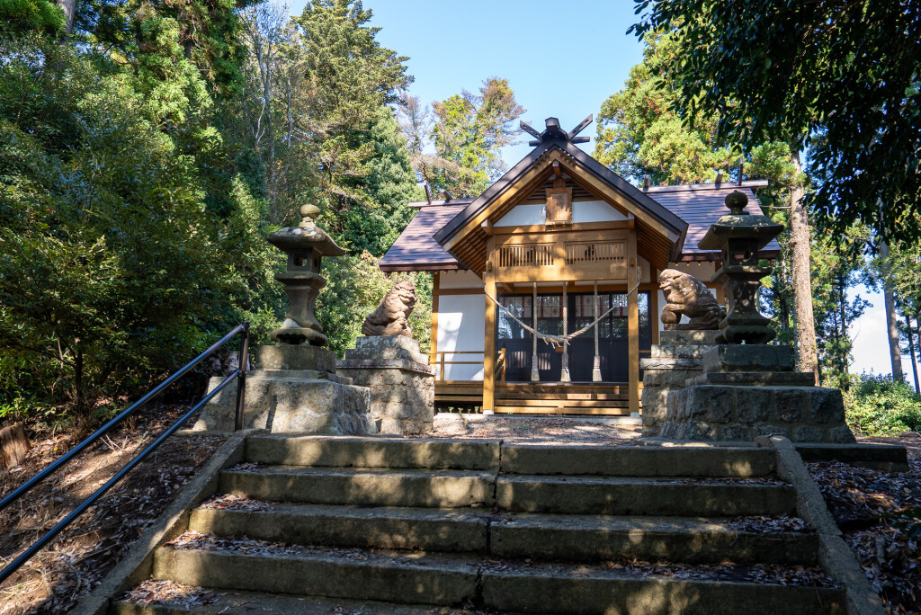 Further uphill, Morotake Suwa Shrine sits among trees, offering a view across the town toward the Pacific Ocean, with a small memorial to those who found refuge there during the tsunami.