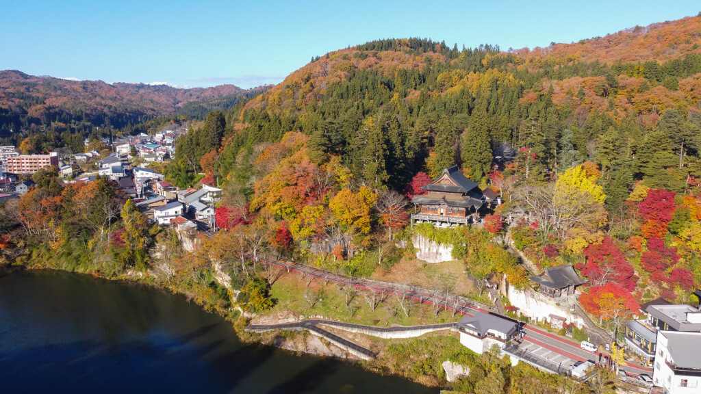 Fukuman Kokuzo Enzoji Temple (Enzoji Temple for short) was built by Tokuichi Daishi, a noted priest from the Aizu region. The main hall of the temple rises high above a huge crag. From here, the Tadami River can be viewed flowing magnificently through the town.