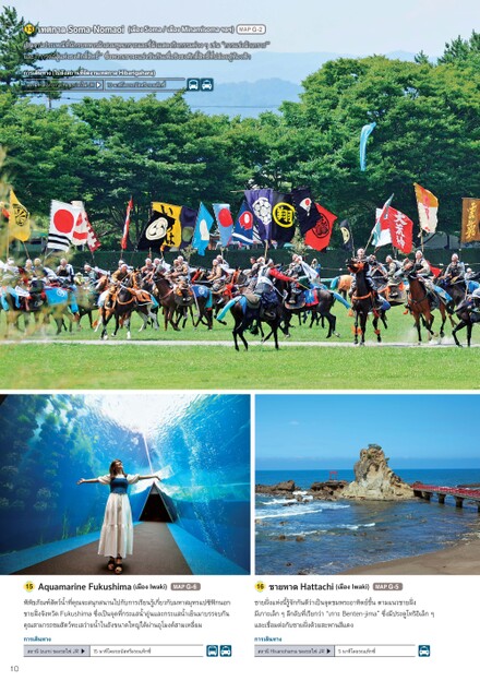 13เทศกาลSoma-Nomaoi(เมืงSoma/เมืงMinami-somaฯลฯ)MAPG-2เป็งานประเพณีีและ“การต่สูัรบทหารม้สวมชุเกราะและขี้แสดงกิกรรมต่งๆเช่“การแข่ม้เกราะ'”ห่ธงศัดิิธิ”ซึพวกเขาจะแข่ขักัเพืชิธงศัดิิธิีล่ยสู้งฟ้การเดิทาง(ไปยัสถานทีังานเทศกาลHibarigahara)สถานีHaranomachiของรถไฟJR▶10นาทีดยรถบัหรืรถแท็ซี15AquamarineFukushima(เมืงIwaki)MAPG-616พชายฝัคิิภัฑ์ัว์ํทีุจะสนุสนานไปกัการเรีนรูกีจัหวัFukushimaซึุสามารถชมสัว์ะเลว่ยนํ่ระแสนํเป็จุทในถัขนาดใหญ่ด้่นอุมงค์ามเหลี่และกระแสนํอมวกัมหาสมุรแปซิินอกเย็มาบรรจบกัชายฝัมและเชืชายหาดHattachiู้แห่นักัดี่เป็จุชมพระอาทิย์ึ(เมืงIwaki)MAPG-5ีกาะเล็ๆลึลัทีมต่กัชายฝัรีกว่“เกาะBenten-jima”ซึด้ยสะพานสีดงตามแนวชายฝัมีระตูทริิล็ๆการเดิทางการเดิทางสถานีIzumiของรถไฟJR▶15นาทีดยรถบัหรืรถแท็ซีสถานีHisanohamaของรถไฟJR▶5นาทีดยรถแท็ซี10