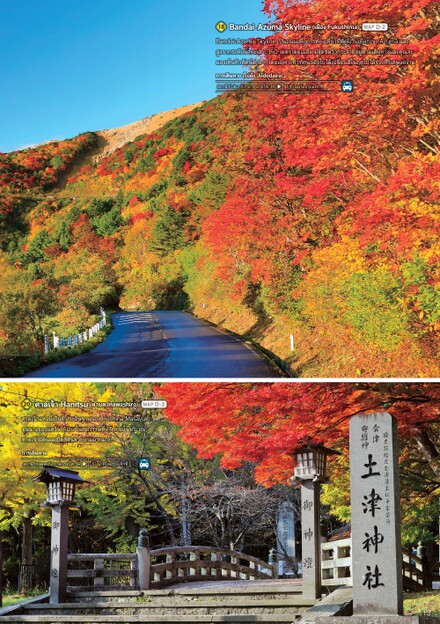 18Bandai-AzumaSkyline(เมืงFukushima)MAPD-2Bandai-AzumaSkylineเป็ถนนเพืสมองเห็ทิทัน์่งๆโดยเฉพาะทิทัน์องใบไม้ปลี้ทะเล1,350เมตรโดยเฉลีูจากระดันการท่งเทีวทีมีุชมวิกระจายอยูัผ่นเทืกเขาAzumaและามเส้ทางและคุจะ่ิศษงดงามนสีนฤดูบไม้่งทการเดิทาง(ไปยัJododaira)สถานีFukushimaของรถไฟJR▶1ชัโมงโดยรถแท็ซี20ศาลเจ้Hanitsu(ตํบลInawashiro)MAPD-3้ป็ทีระดิฐานของHoshinaMasayukiุนางของแคว้Aizuในศตวรรษที17ภายในบริวณศาลเจ้แห่นขศาลเจ้มี้เมเปิสีัสวยงามมากมายการเดิทางสถานีInawashiroของรถไฟJR▶10นาทีดยรถแท็ซี13