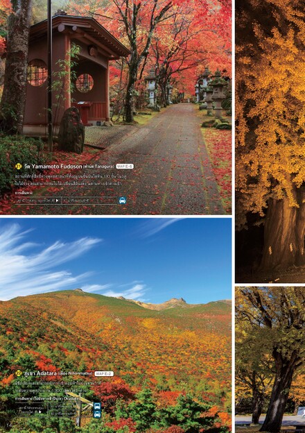 21้อยูนขัวดYamamotoFudoson(ตํบลTanagura)MAPE-6สถานที์างพุธศาสนาทีัดิใบไม้่งคุสามารถชมใบไม้ปลีนสีังดงามตามทางเข้ศาลเจ้บัไดหิ130ขัในฤดูิธการเดิทางสถานีChikatsuของรถไฟJR▶10นาทีดยรถแท็ซี22ภูขาAdatara(เมืงNihonmatsu)MAPE-2ีื่กระเช้ลอยฟ้ไปยัจุชมวิทีเสีงและสามารถนมระดัความสูประมาณ1,300เมตรได้ีด้ยการเดิทาง(ไปยัทางเข้ปีเขาOkudake)สถานีNihonmatsuของรถไฟJR▶50นาทีดยรถบั30นาทีดยรถแท็ซี14