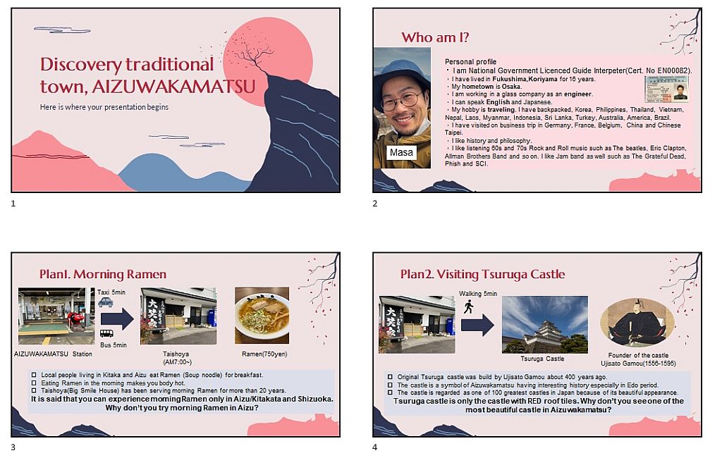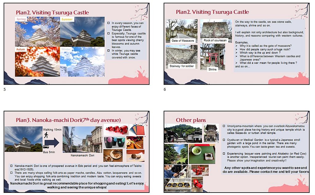 歴史情緒あふれる会津若松を堪能するガイドツアー! プラン1. 会津若松で朝ラーメン プラン2. 鶴ヶ城散策 プラン3. 七日町通で伝統工芸品のウィンドウショッピング&食べ歩き その他 飯盛山、御薬園、赤ベコ絵付け、会津塗蒔絵体験など、リクエストにより、ガイディングをアレンジします!